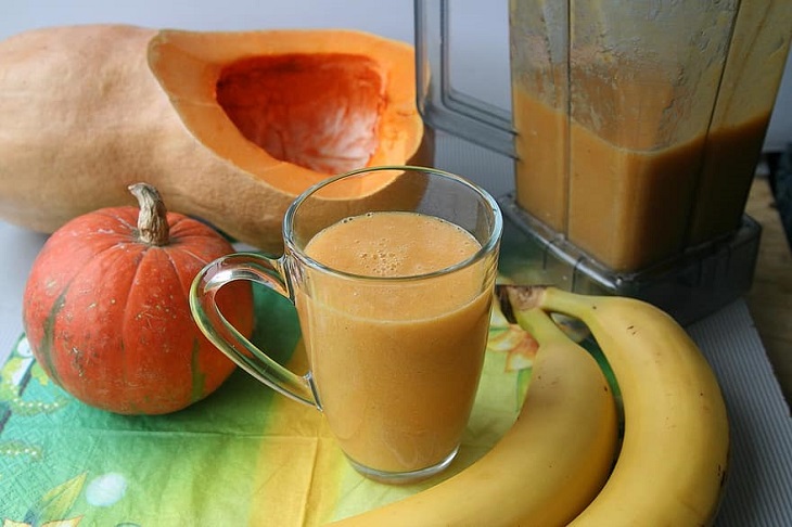 لإضفاء الحيوية على عصير فطيرة اليقطين، ابدأ بمزج هريس اليقطين مع نصف موزة وحليب الصويا. أضف توابل فطيرة اليقطين وخلاصة الفانيليا والعسل لتقوية النكهة ثم أضف القليل من مكعبات الثلج ثم قم بمزجه جيداً.