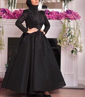 لعاشقي اللون الأسود هى الفستان هو قطعة فنية مميزة لعاشقات الأسود، لون فخم أسطوري إعتمدت هنا العارضة على تنسيقات بنفس اللون من الحجاب إلى الحذاء، وزينت الإطلالة ببعض الإكسسوارات الماسية.