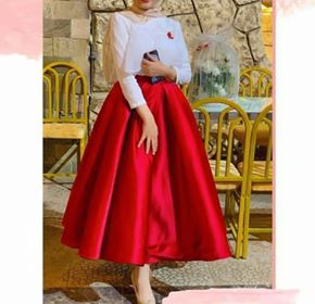 اذا كنتي من محبي التغيير، هذا الفستان مكون من قطعتين عصريتين توب أبيض بسيط وتنورة واسعة باللون الأحمر الجرئ.
