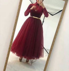 لمحبي الأناقة والرقي، هذا الفستان لكي تماماً، اختارت العارضة فستان باللون الأحمر الداكن ( النبيتي) وحزام خصر باللون الذهبي، وزينت الإطلالة بحجاب باللون النبيتي وحذاء باللون الذهبي.
