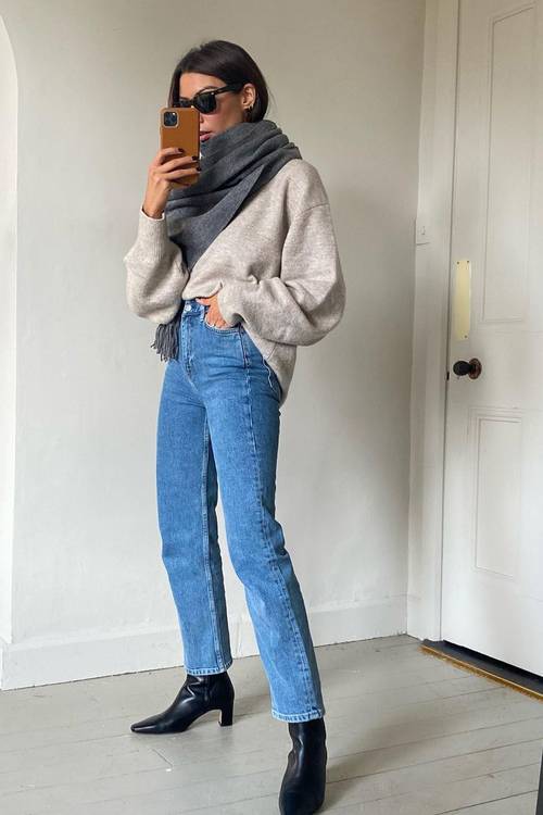 هذه الإطلالة من استايل الشارع عصرية ومريحة وتتميز بالاناقة، ارتدِ سروال من الجينز الفاتح مع سترة صوفية خفيفة اوفر سايز واحرصي على وضع الجزء الأمامي من السترة دخل السروال واتركي الجزء الخلفي منسدل على خصرك وبما ان موضة الاسكارف رائجة الآن يمكنكِ تنسيق اسكارف حول عنقك واكملي مظهرك بزوج من أحذية بوت الكاحل السوداء.