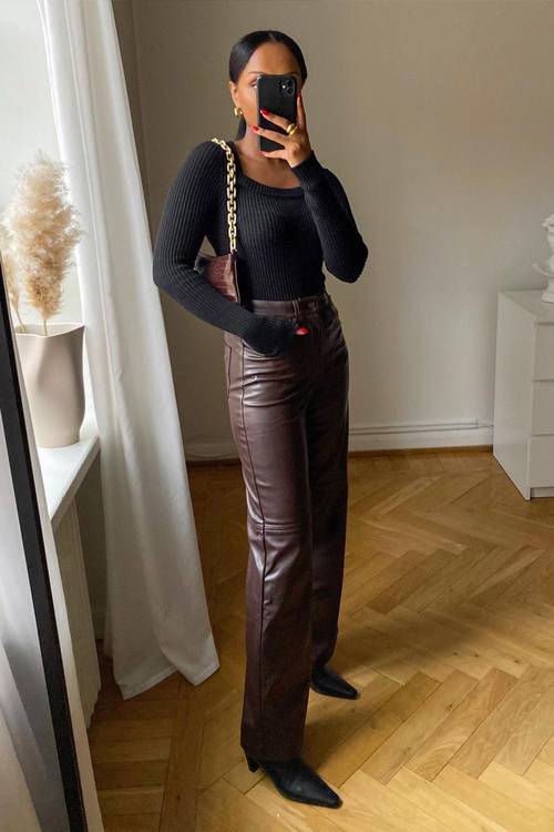 الى كل محبي الجلود، اغتنمي الفرصة هذا الشتاء وطبقي موضة ستايل الشارع المميزة و ارتدي سروال جلدي طويل باللون البني الداكن وكنزة صوفية مستديرة العنق باللون الأسود ونسقي مع الاطلالة حقيبة السلاسل الرائجة واحذية البوت الجليدة الانيقة.