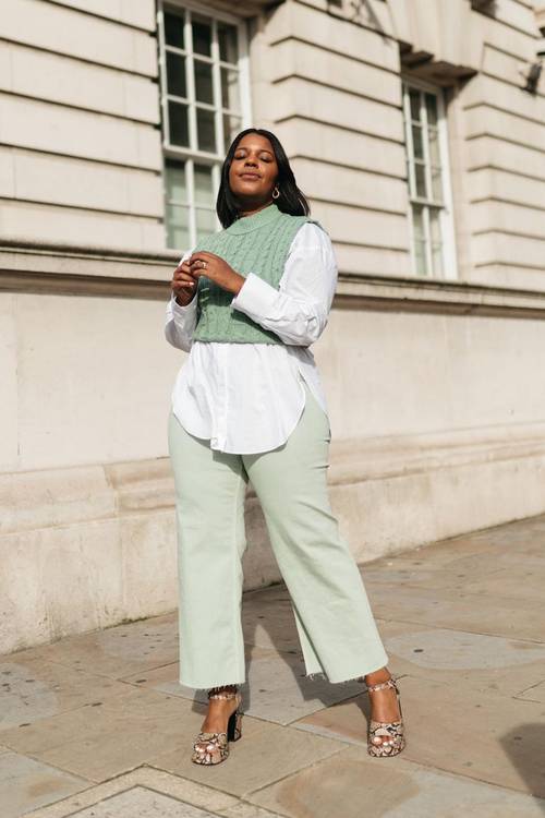 تميل الكثيرات للألوان الداكنة في فصل الشتاء ولكن هذه الإطلالة هي لمحبي الألوان الفاتحة حتى في الأجواء الباردة، ارتدِ سروال من الجينز الملون واسع الساقين والذي لا يتجاوز طوله الكاحل وقميص كلاسيكي يغطي الخصر وايضًا سترة صوفية محاكة من نفس لون السروال، و لتحصلي على الاهتمام الذي تريدينه نسقي احذية الكعب العالِ بنقشة جلد الثعبان الأنيقة.