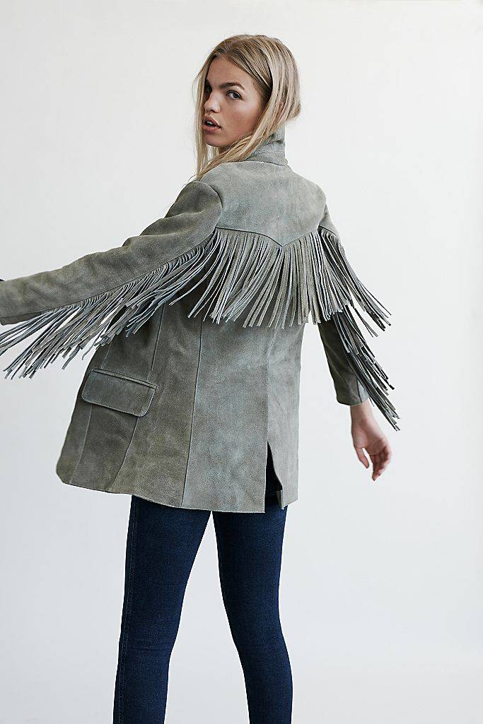 ارتدِ سروال من الجينز الداكن وسترة من الشمواه باللون الرمادي ونسقيها مع حقيبة وحذاء باللون الأسود.
