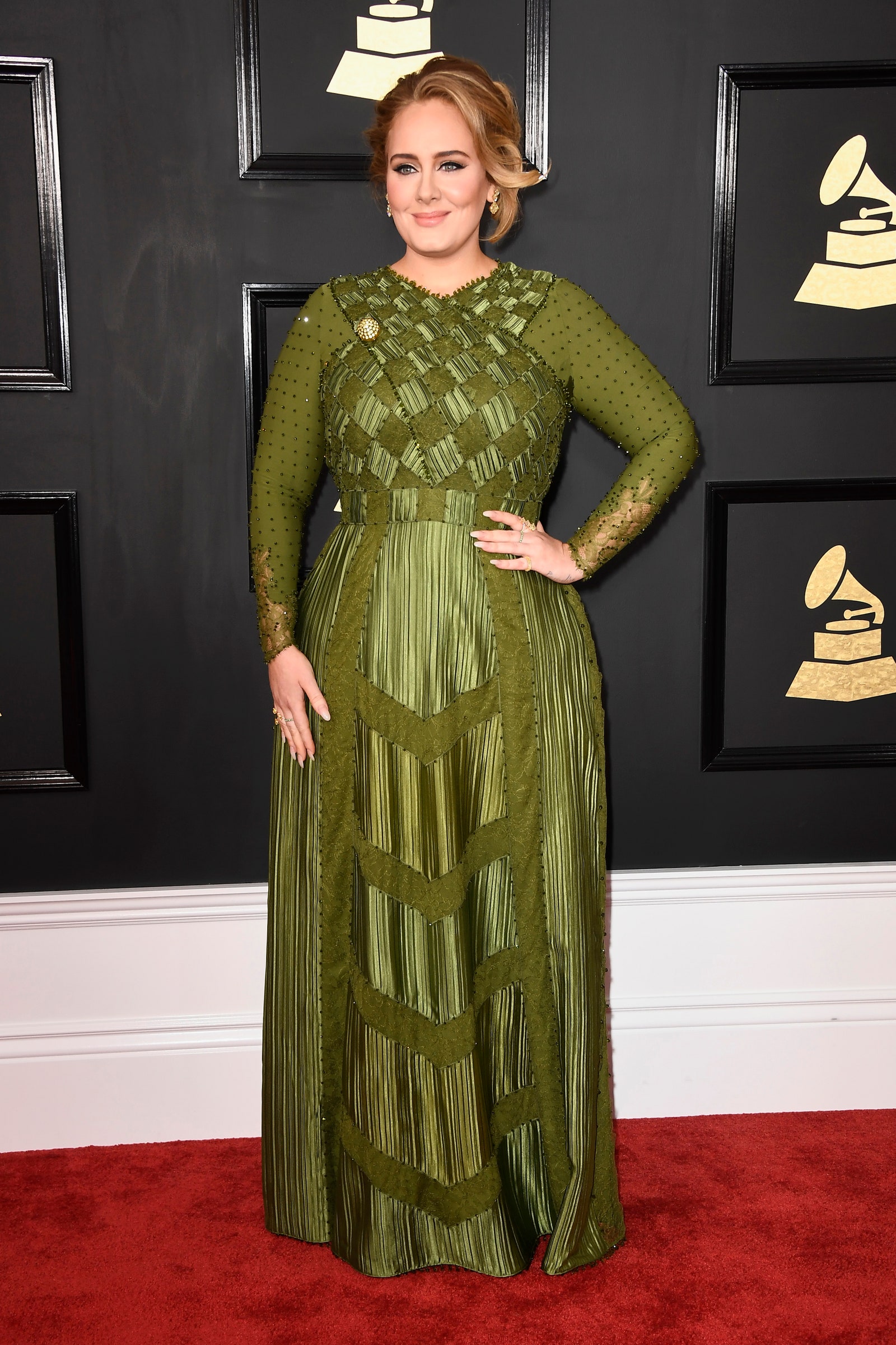 ظهرت المغنية الشهيرة أديل بفستان أخضر من جيفنشي ومجوهرات ذهبية وبدت في غاية الجمال.
