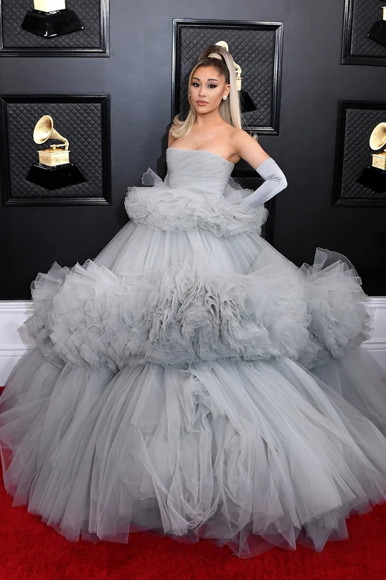 من الإطلالات التي تركت علامة مميزة في تاريخ السجادة الحمراء لمهرجان غرامي فستان التُل الذي ارتدته المغنية الشهيرة اريانا غراندي بطول 20 قدماً من مجموعة مصمم الأزياء الإيطالي جيامباتيستا فالي.