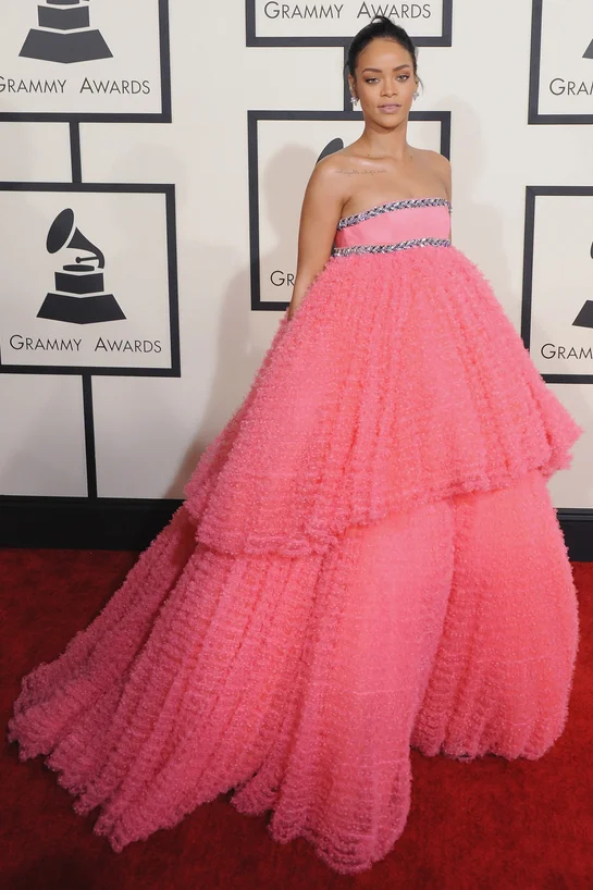ظهرت المغنية الباربادوسية ريهانا بفستان زهري كبير من مجموعة أزياء المصمم الإيطالي جيامباتيستا فالي.