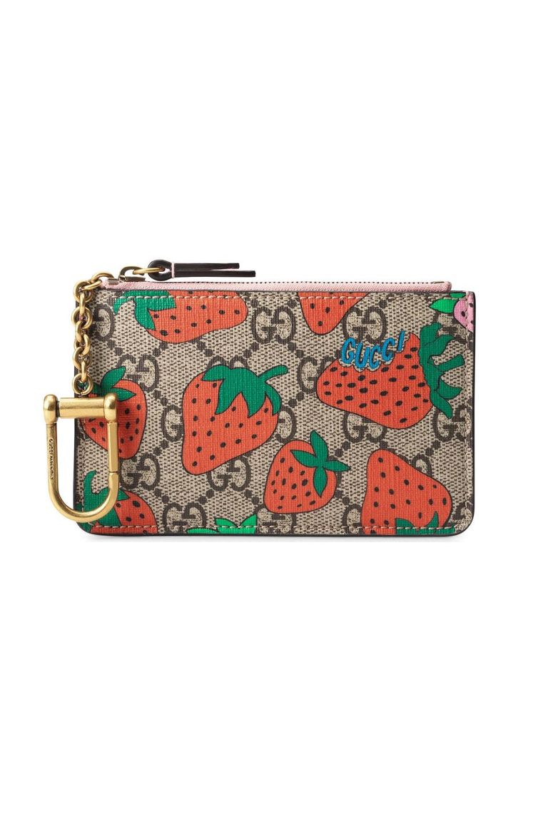 أصدرت غوتشي هذا الملحق الصغير المثالي بطباعة الفراولة الذي يفيدك عند القيام بمهام سريعة وتريدين حمل بطاقات الائتمان والمفاتيح فقط، والتي يمكنك إرفاقها بالحلقة الملتصقة بالمحفظة.