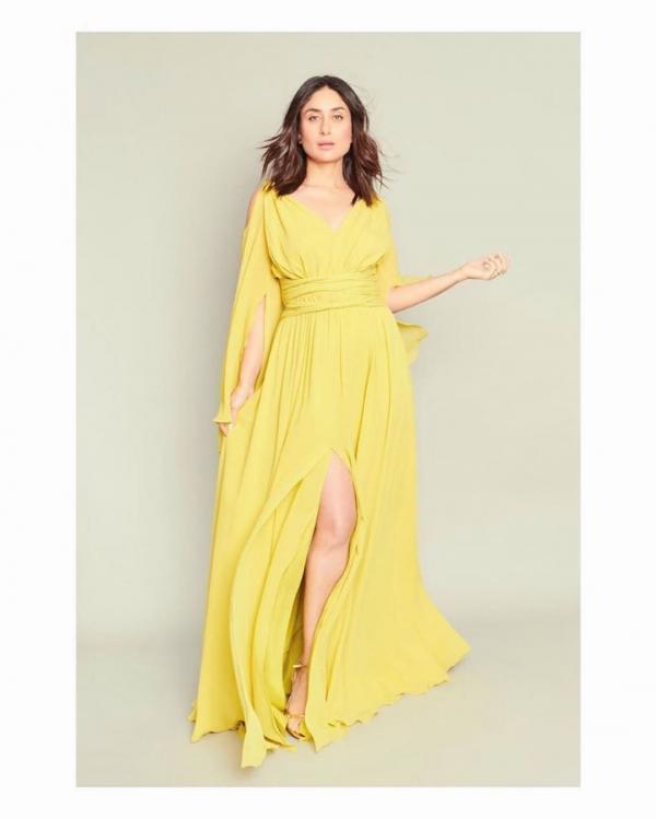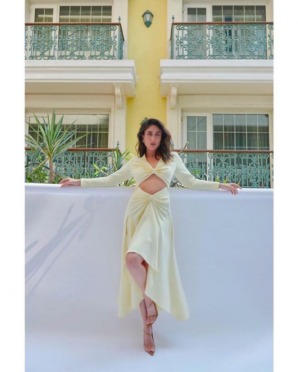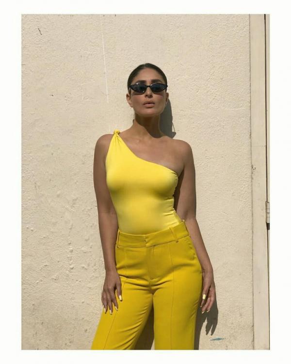 القطعة الصيفية الثالثة المميزة من خزانة الديفا الهندية كارينا كابور هو سروال قماشي باللون الاصفر وتوب بكتف واحد مع إرجاع الشعر بكامله للخلف.