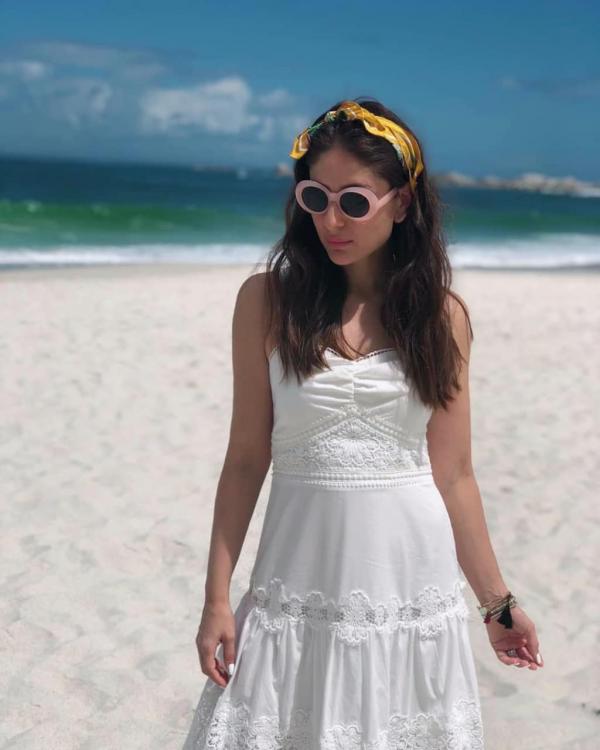 ومن القطع المميزة التي ارتدتها كارينا هو فستان أبيض بسيط من القطن يتلائم مع حرارة الصيف وما اضفي جمالًا وأنوثة على هذه الإطلالة هو إضافة بندانة رأس ملونة ونظارات شمسية بإطارات بيضاء.