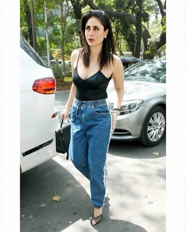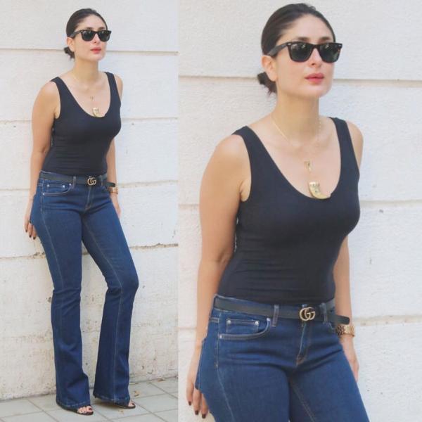 ارتدت كارينا سويت بانتس من الجينز الأزرق مع حذاء كعب عالِ وبدي مكشوف كصيحة اساسية من صيحات هذا الصيف.