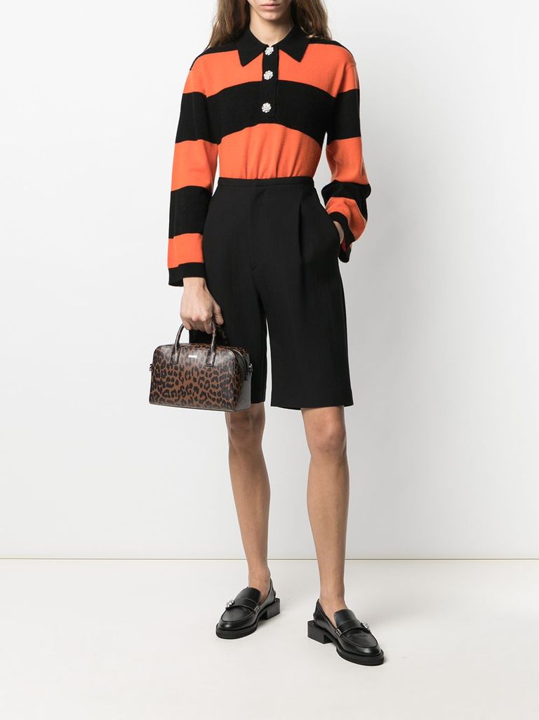 يمكنكِ إرتداء كنزة كشمير بياقة البولو ومخططة بشكل أفقي بالألوان التي تريدها مثل الأسود والبرتقالي الداكن ونسقيها مع سروال أسود قصير أو طويل وإذا كنتِ محجبة يمكنك وضع غطاء رأس باللون الأبيض أو الأوف وايت.