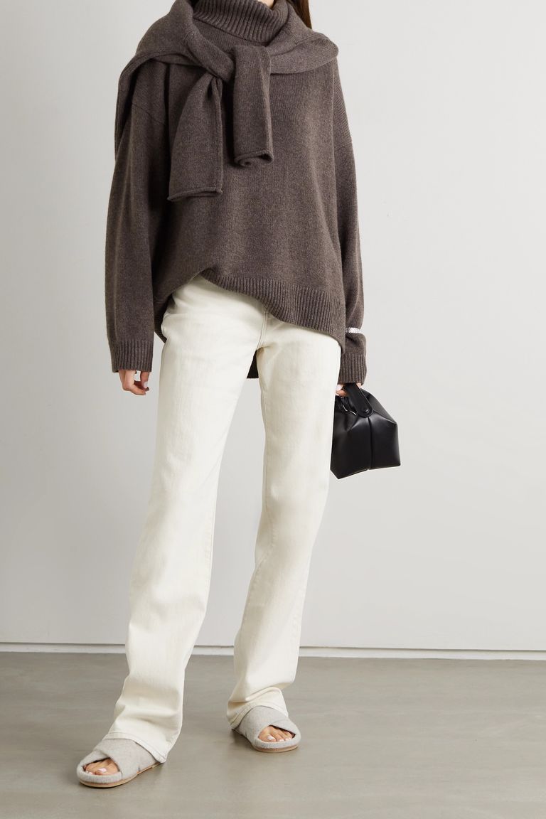 ارتدِ كنزة الكشمير الأوفر سايز بياقة ال Boat Neck العريضة و اقرنيهم ببنطال كريمي أو ابيض أو بني.