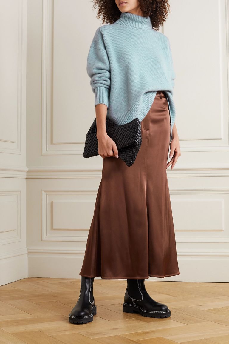 من القطع المميزة ل كنزات الكشمير، التي تحتوي على ياقة ال Turtleneck مع إضافة طبقات للكنزة مثل ربط قطعة أخرى على الأكتاف وإذا كنتِ محجبة تستطيعي تنسيقها مع تنورة أو سروال جينز أو من الجلد الأسود وارتدِ حجاب منقوش بجلود الحيوانات لابراز أناقتكِ.