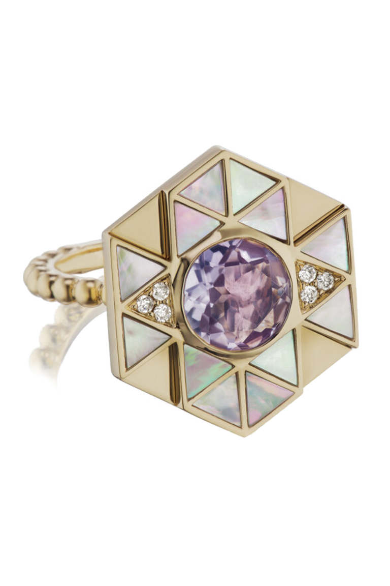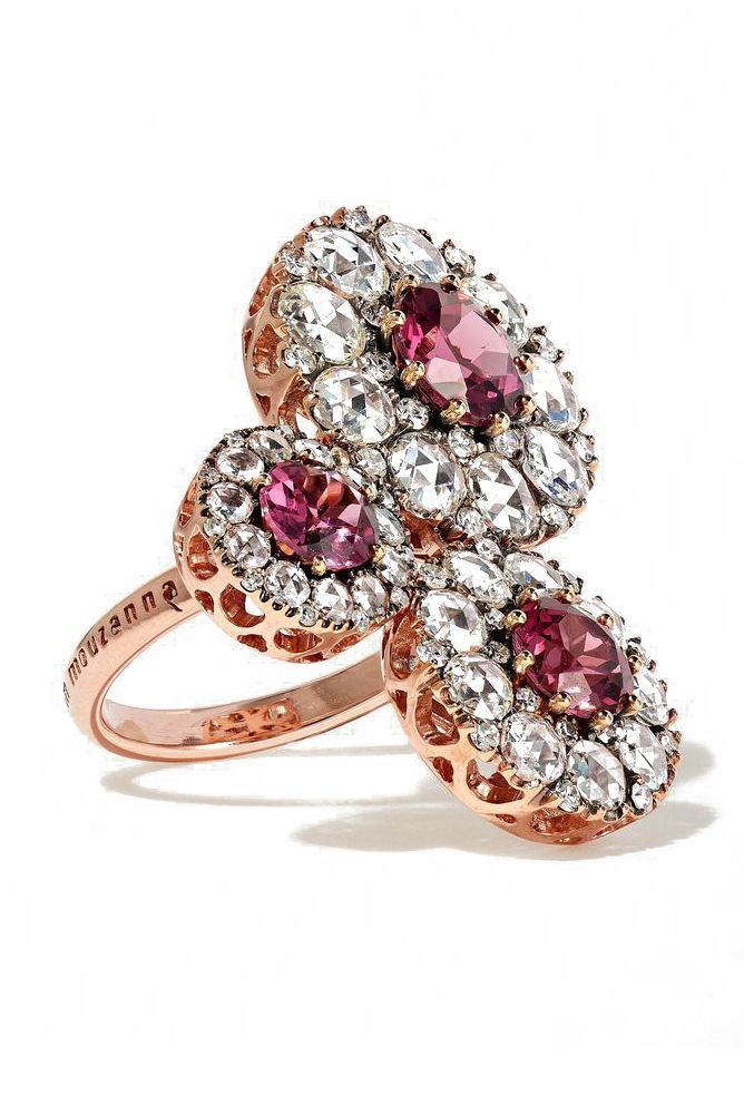 هذا الخاتم الأنيق المميز من تصميم سليم مزنر وهو مصنوع من الألماس والذهب الوردي وحجر الرودوليت.