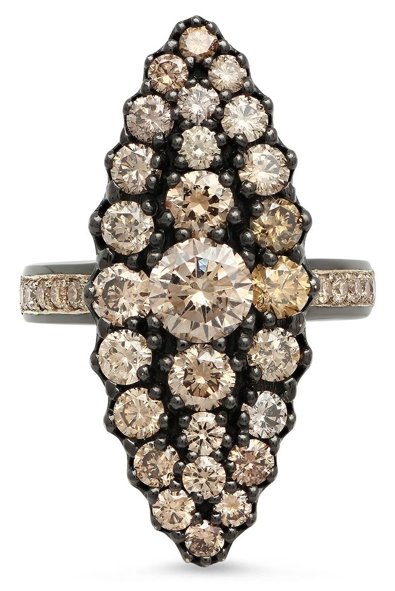 هذا الخاتم المميز من مجموعة كوليت ويطلق عليه الخاتم العنقودي جين دارك ماركيز وهو يجمع بين حبات الألماس الأبيض واللؤلؤ الأسود.