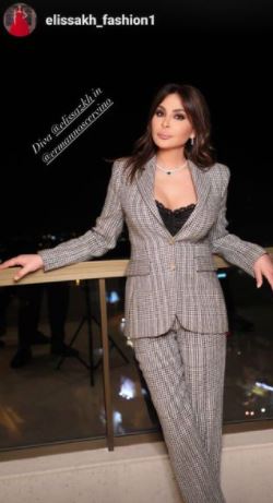 نشرت الفنانة اللبنانية إليسا صورة جديدة لها عبر حسابها في إنستغرام ظهرت فيها مرتدية بدلة باللون الرمادي، وأسفلها توب أسود مفتوح من ناحية الرقبة.