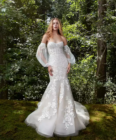 يحظى تصميم الأوف شولدر بمكانة خاصة بين مختلف التصاميم، بما في ذلك فساتين الزفاف، ولكنه هذه المرة يتميز بأسلوب مختلف أكثر جاذبية وأنوثة، وهو الأكمام المنفوشة.