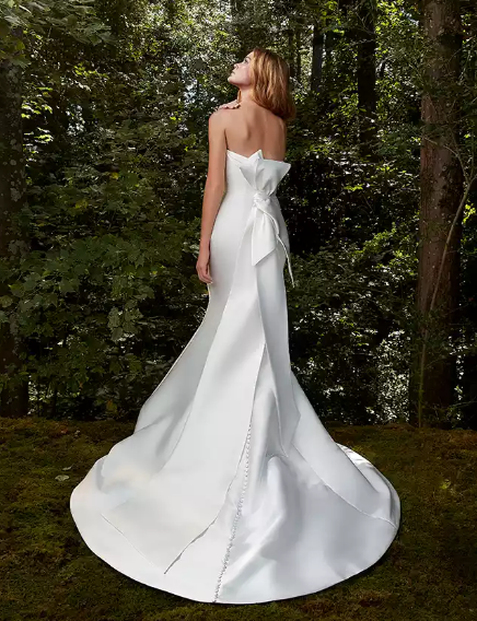 في حين تُضاف الفيونكة إلى الفساتين كلمسة بسيطة، سواء من خلال الحزام أو غيره من قطع للزينة، إلا أنها تظهر في موضة زفاف خريف 2021 بشكل مختلف، وهو التصميم الماكسي الضخم لتدمج معها الذيل أو أحد جوانب الفستان.