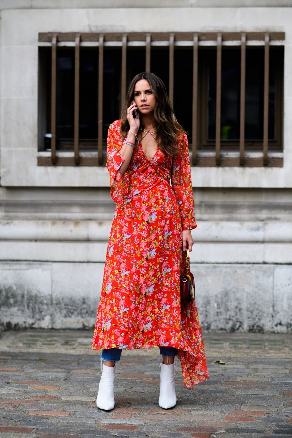 يمكنكِ اتباع صيحة البوب بإرتداء فستان طويل ملون بطبعة الأزهار مع أحذية الأنكل بوت البيضاء ذو الكعب العالِ.