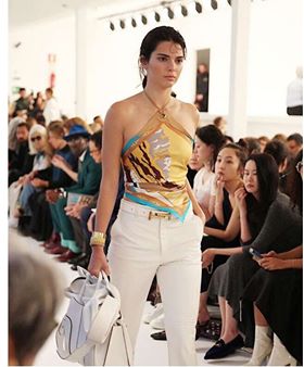 ظهرت عارضة الأزياء العالمية كيندل جينير في أحد عروض الأزياء بسكارف توب باللون الذهبي المزقرش وبنطال باللون الأبيض الملكى، وظهرت كيندال قمة في الأناقة والنعومة.
