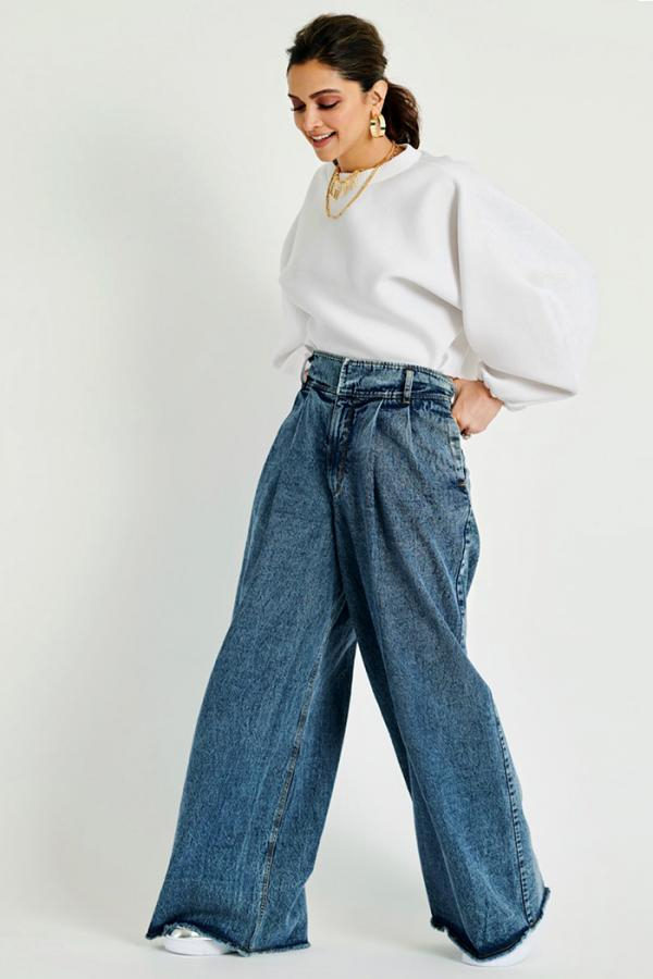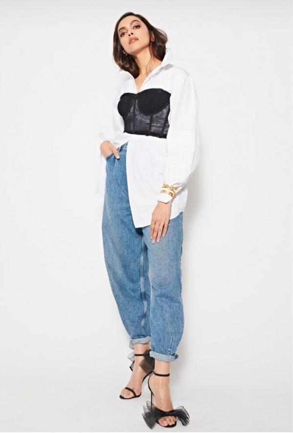 اعتمدت جميلة بوليوود دبييكا بادكون علي بنطلون جينز واسع ونسقت معه قمبص واسع أبيض وكروب توب باللون الأسود، مع حذاء عالي باللون الأسود.