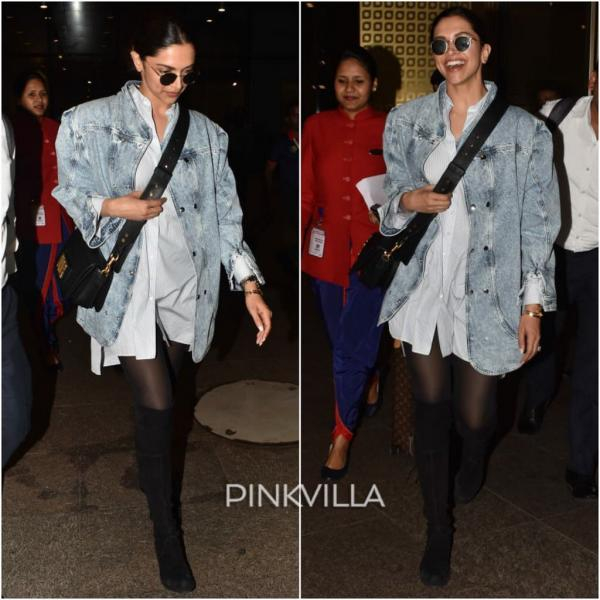هنا قررت دبييكا ارتداء بوى فرينت جاكيت من الجيمز الأزرق الفاتح، ونسقته بطريقة عصرية فقد اعتمدت قميص أبيض واسع، وشراب شفاف باللون الأسود وبوت أسود طويل وحقيبة سوداء.