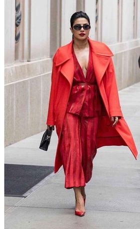 اعتمدت النجمة العالمية بريانكا تشوبرا علي بدلة باللون الحمر وكوت أحمر طويل، وزينت الإطلالة بحذاء احمر ونظارة وحقيبة باللون الأسود، وبدت تشوبرا في غاية الجمال.