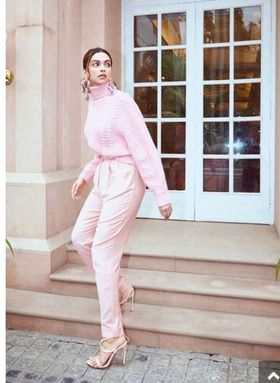 أعتمدت نجمة بوليوود دبيكا بادكون علي لإطلالة زاهية باللون الوردى، وأكملت بادكون الإطلالة ببعض الإكسسوارات الوردية وحذاء عالي مكشوف باللون الوردى وبدت دبيكا في غاية البساطة والرقي.