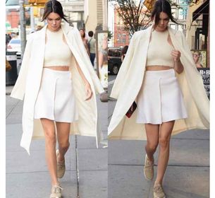 ظهرت نجمة الواقع وعارضة الأزياء العالمية كيندال جينر بتنورة قصيرة وتوب وجاكيت باللون الأوف وايت، ونسقت معه كيندال حذاء رياضي باللون البيج.