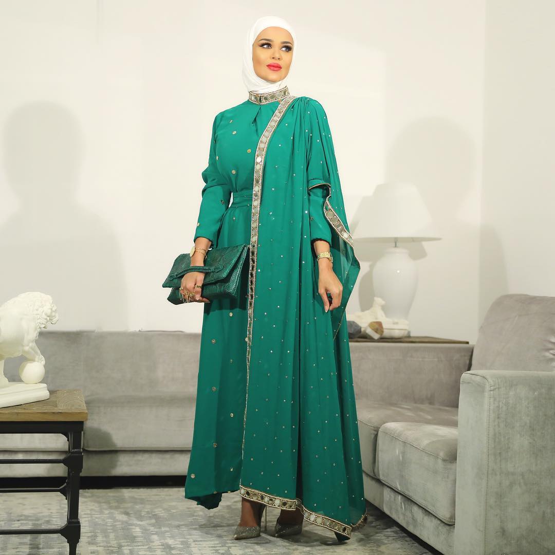 اخطفي الأضواء بالفساتين الطويلة بتصميم قريب للساري الهندي للإطلالات الليلية، إذ كسرت اللون الفيروزي للفستان ونعومته بحقيبة كلاتش بدرجة الأخضر الغامق بطبعة جلد الأفعى، أما الحجاب فاللون الأبيض يعتبر الأنسب لإبرازالمكياج بدلاُ من الحجاب الملون.