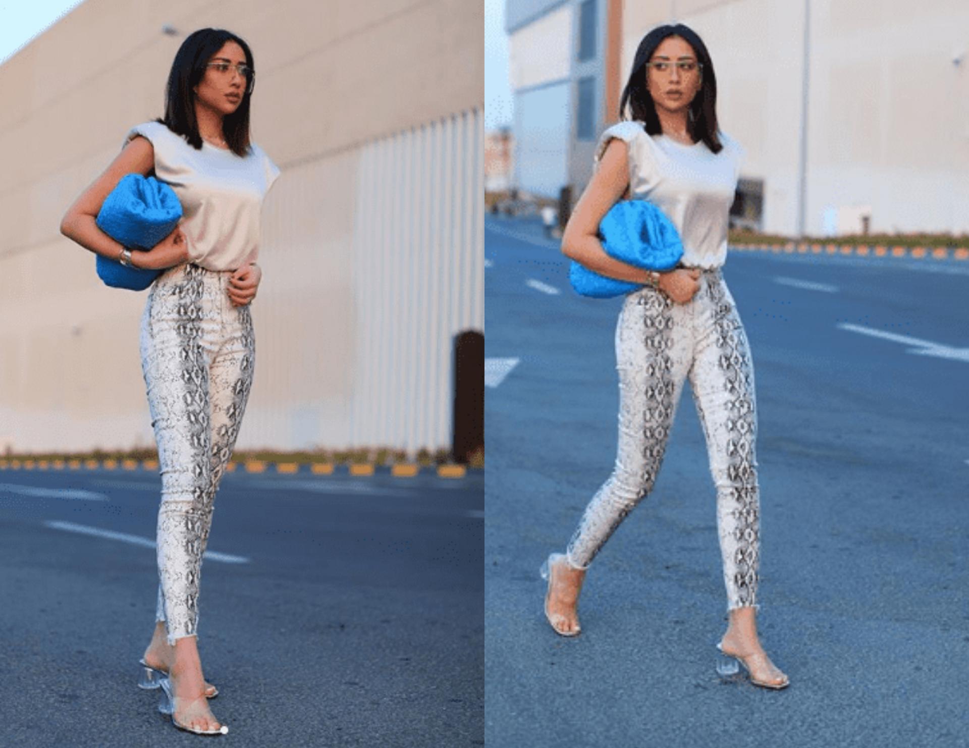 إطلالات العيد لم تعتد تقتصر على الفساتين، يمكنك اختيار البنطلون الضيق بنقشات مختلفة وتنسيق التوب المناسب مع حذاء شفاف والذي يعتبر من أخر صيحات الموضة المتبعة.