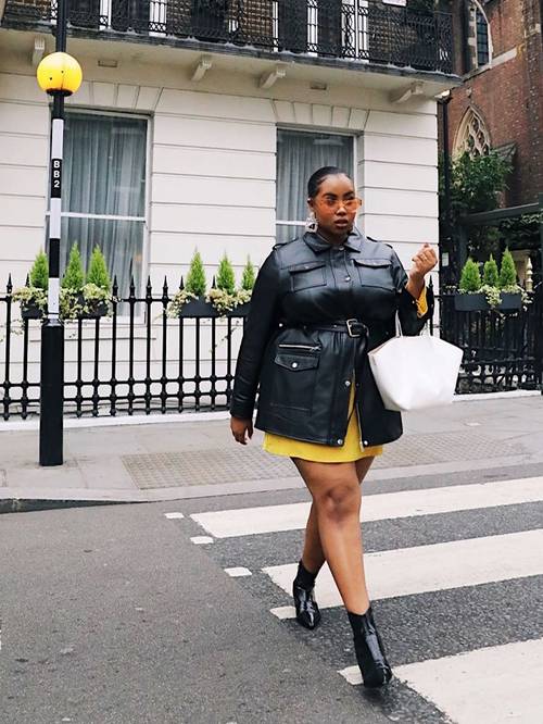 يمكنكِ تنسيق فستان اصفر صيفي قصير مع جاكت جلدي اسود متوسط الطول واكملي الإطلالة بهاف بوت من الجلد الأسود اللامع ولكسر حدة اللون الأسود تستطيعين حمل حقيبة جلدية بيضاء.