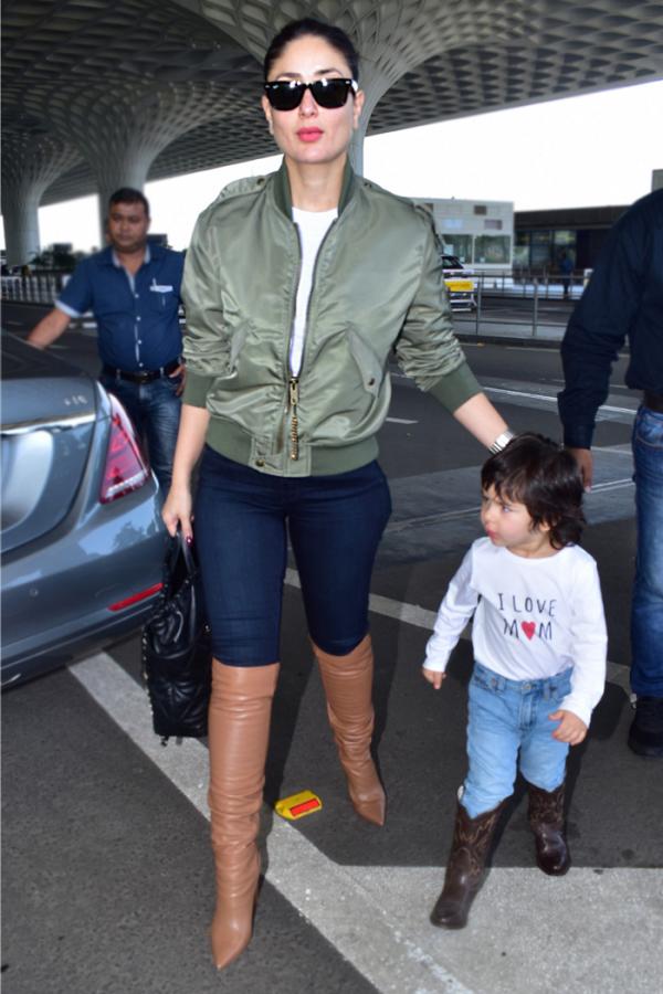 اعتمدت السيدة خان هنا علي سترة بومبر عصرية باللون الأخضر الزيتوني ونسقتها ببساطة فقد اعتمدت توب أبيض وبنطال جينز باللون الأزرق الداكن، وبوت باللون الهافان صل لإلى الفخذين.