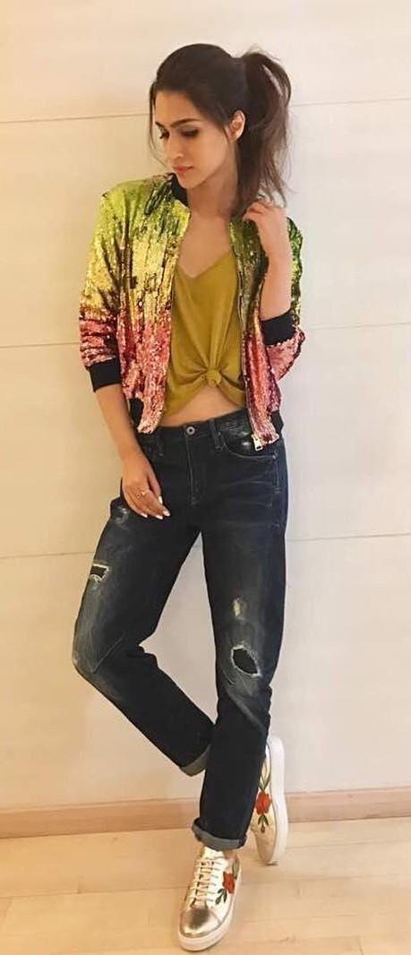 اعتمدت هنا جميلة بوليوود ديبيكا علي سترة بومبر باللون الذهبي الميتاليك، ونسقته بطريقة شبابية بسطة فقد اعتمدت توب كروب اللون الأسود وبنطال رياضي باللون الأسود وحذائ رياضي باللون الأسود.
