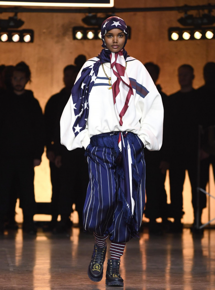 كان آخر عروض حليمة "عرض تومي هيلفيغر" في لندن حيث سارت على المدرج مرتدية حجابًا مصنوعًا من العلم الأمريكي. "ما زلت أشعر بالقشعريرة في التفكير في الأمر"