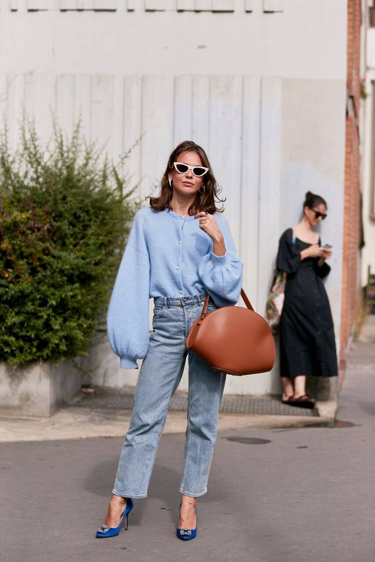 درجة مميزة من البرتقالي وليست زاهية بصورة مبالغ فيها، وبدلًا من الاضطرار لارتداء أكثر من طبقة، اختاري بلوزة ذات رقبة عالية واكمام فضفاضة بعض الشيء، لاسيما ذات التصميم المنتفخ مثل الواضح بالصورة، ونسقيها مع بنطلون جينز واسع ذا درجة فاتحة من الأزرق وأكملي اطلالتك بحذاء وحقيبة باللون الأسود.