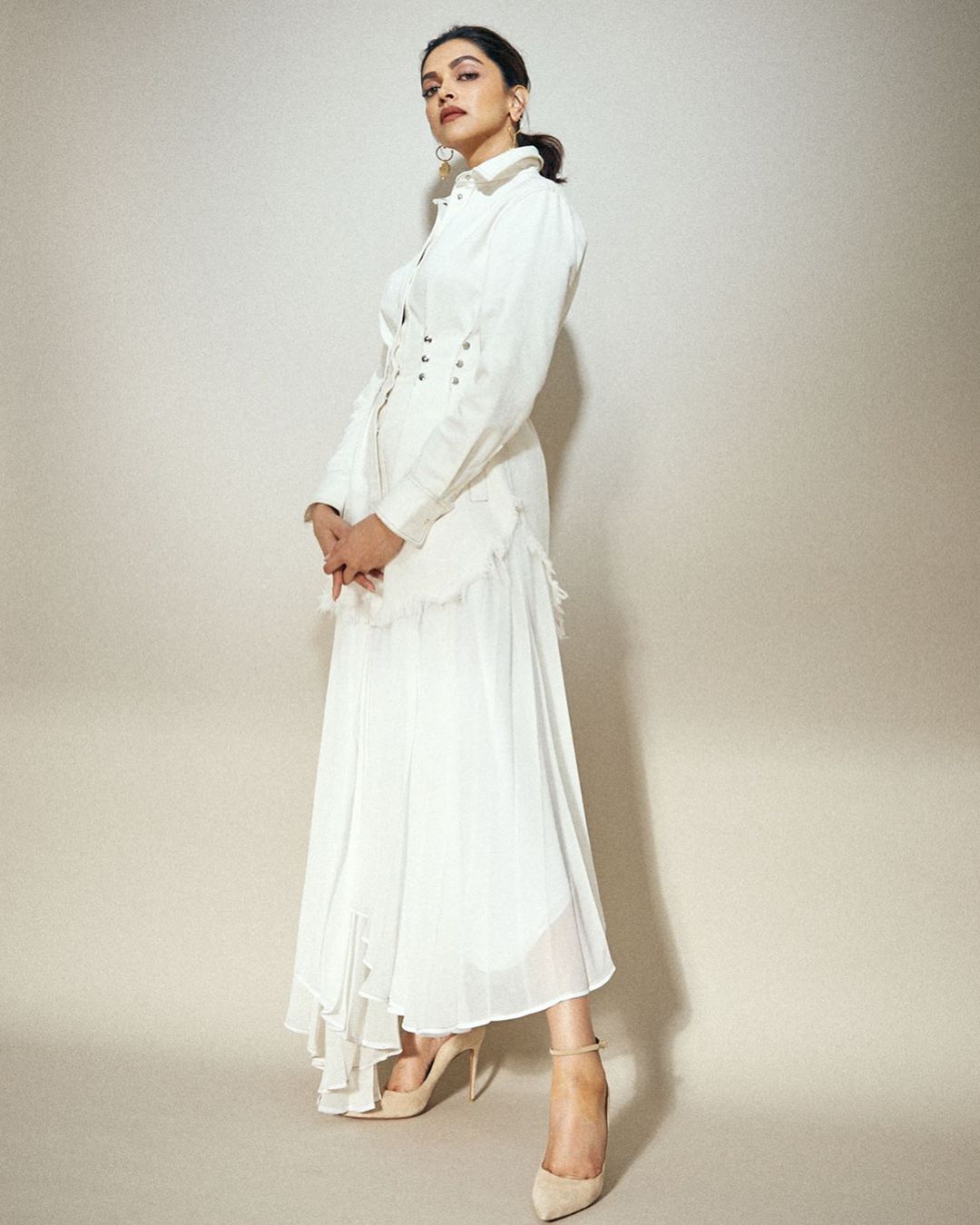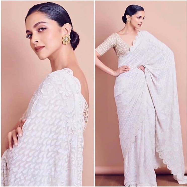 عندما نتحدث عن ديبيكا بادوكون، من الصعب أن نفتقد ساريها، فقد اختارت هنا دبيكا سارى أبيض بقماش من الدانيل المزخرش، وزينت الإطلالة بكعكة الشعر المنخفضة الأنيقة ومكياج بسيط.