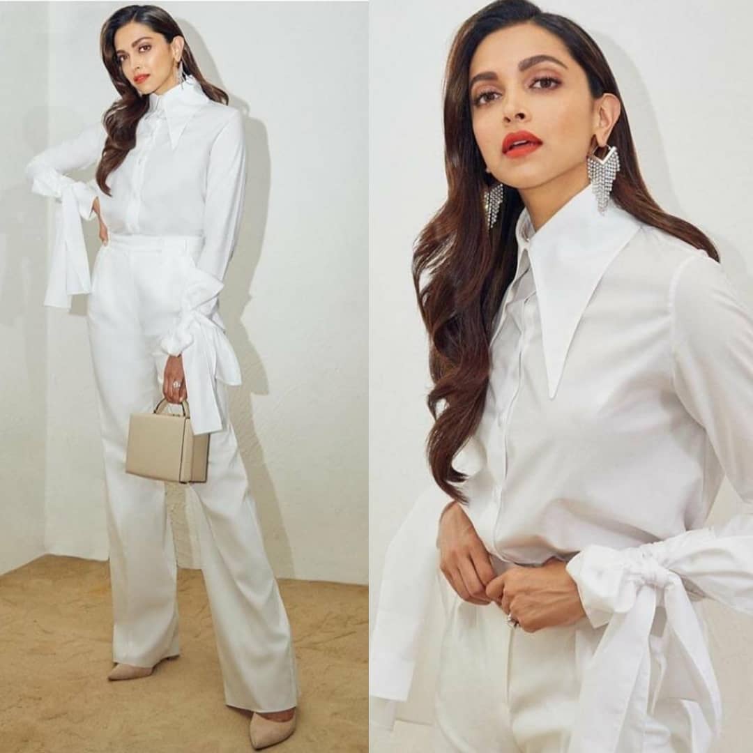 انتقلت هنا ديبيكا نقلة سريعة وعصرية، فقد اعتمدت علي قميص أبيض مع ياقة كبيرة وأكمام مربوطة، ونسقت معه بنطال أبيض كلاسيكى، ويزنت الإطلالة بمجوهرات ماسية وحذاء وحقيبة باللون البيج واعتمدت علي حمرة باللون الحمر وشعر مموج عريض.