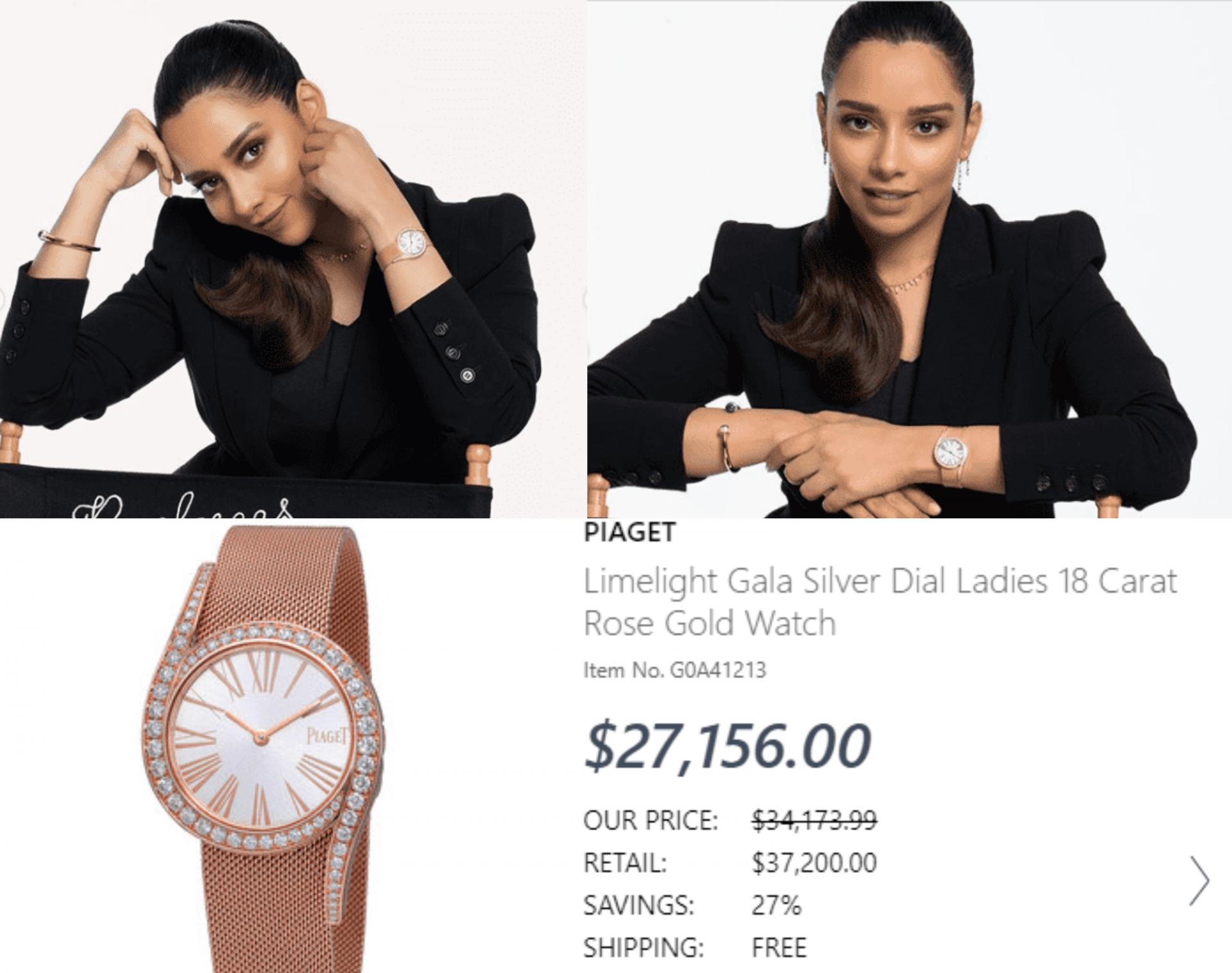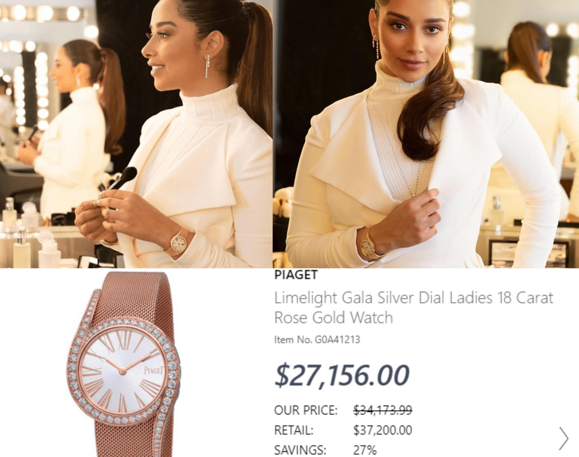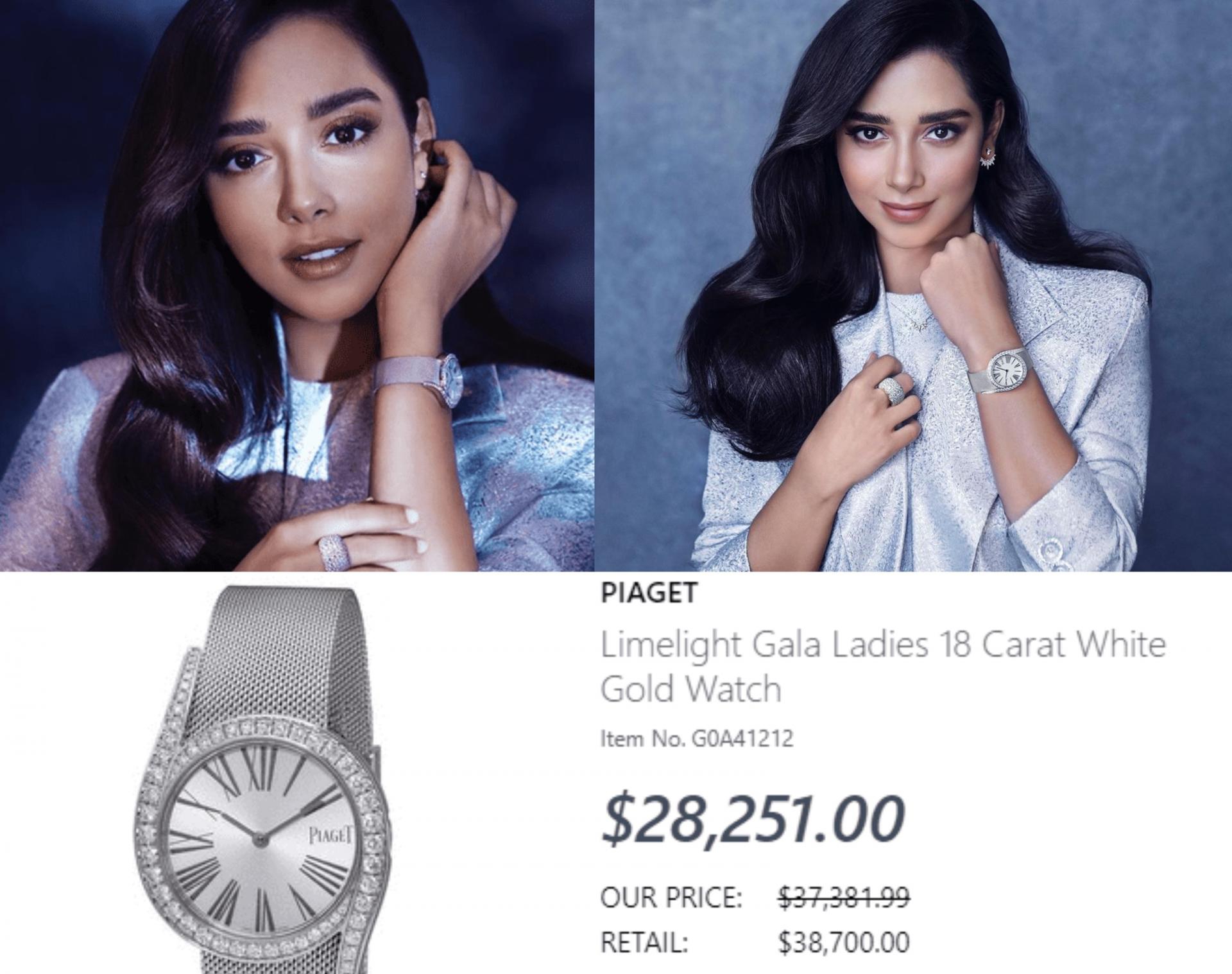 مرصعة بـ 18 قيراط من الذهب الأبيض وصل سعرها لـ 28.000 آلف دولار بعد الخصم المعروض من العلامة التجارية، أي ما يعادل 105.000 آلف ريال سعودي