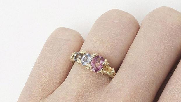 من افضل القطع التي قدمها المصمم البريطاني روث توملينسون هو خاتم باحجار كريمة مزخرفة بإطارات بسيطه من الذهب وبألوان زاهيه مثل اللبني والأرجواني.