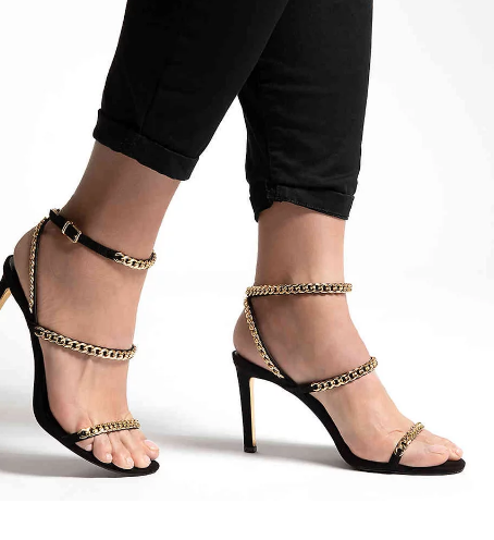 يباع بـ 69.99 دولارًا، ويناسب هذا الحذاء الحفلات والزفاف، وتم تزويده بسلاسل ذهبية حادة مع الكعب المعدني كما أنها تأتي باللون الأبيض.
