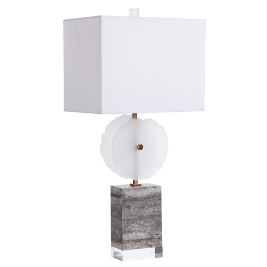 زجاج بلوري صافي مصمم على هيئة أوراق الزئبق مثبت على مجسّم من الحجر الطبيعي، والذي يماثل حجر "ترافرتين" الجيري بتدرجات من اللون الرمادي واللون الرمادي الداكن، مع قاعدة كريستالية صلبة ولمسات خفيفة من النحاس المعتّق. هذا المصباح هو الاختيار المثالي لتزين طاولة الطعام أو المنضدة الرئيسية.