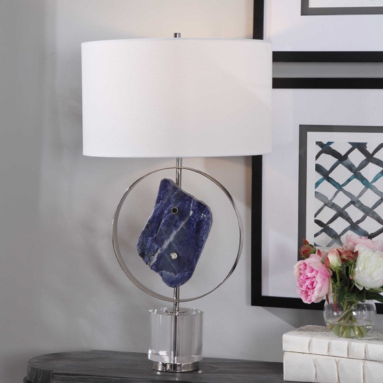 يضم هذا المصباح قطعة كبيرة من حجر اللازورد يتم استخراجها من مناجم في آسيا الوسطى في وادي السند منذ آلاف السنوات. وقد أصبحت هذه الأحجار اليوم ذات قيمة عالية بفضل لونها الأزرق الغني. وتعتبر كل عينة من هذا الحجر قطعة فريدة، حيث تختلف كلٌ منها قليلاً من حيث الحجم واللون لتضفي لمسات من التفرّد في أي غرفة معيشة.