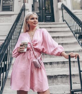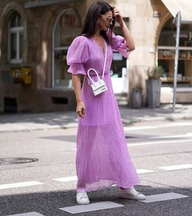 ظهرت هنا العارضة بحقيبة باللون الأبيض الملكى المناسب مع جميع الأزياء ونسقت معها فستان أنيق باللون اللافندر، وحذاء رياضي أبيض.