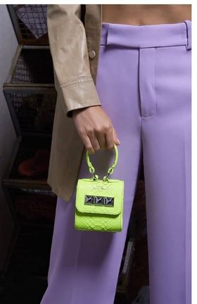 لمحبي ألوان النيون، هذه الحقيبة مناسبة لكى تماماً، ونسقت هنا العارضة معها بنطال باللون اللافندر الرائج ، ومعطف جلد باللون البيج.