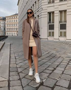 هنا اختارت العارضة حقيبة مايكروا باللون البنى الداكن ونسقتهل مع معطف شتوى باللون الكافيه وفستان قصير باللون البيج، وزينت الإطلالة بحذاء رياضي أبيض.