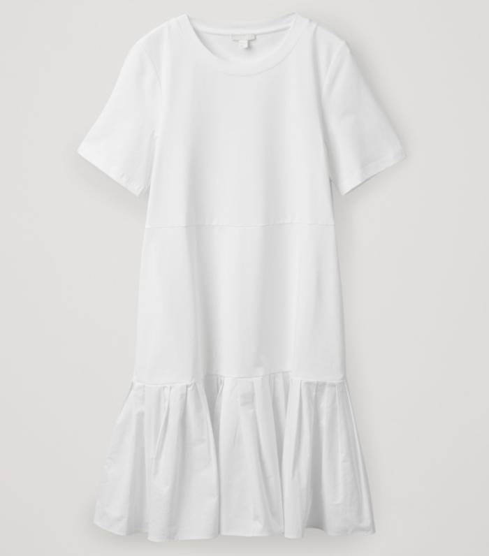 يمكنكِ تنسيق هذا الفستان القطني الأبيض مع بنطال جينز بوي فريند وتستطيعي إرتداء بعض الأكسسوارات مثل السلاسل ذات الطبقات وحقيبة خصر صغيرة وإذا كنتِ محجبة يمكنكِ إرتداء البونشو الواسع.