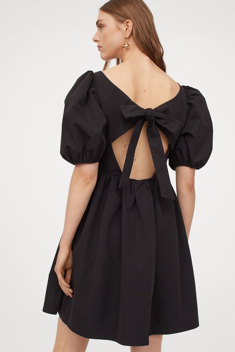 هذه الإطلالة الصيفية لا تصلح فقط للحفلات ولكنها مناسبة للخروج مع الأصدقاء والمناسبات الليلية، تستطيعِ إرتداء فستان قطني أسود قصير بأكمام منتفخة وفتحة الظهر المميزة.