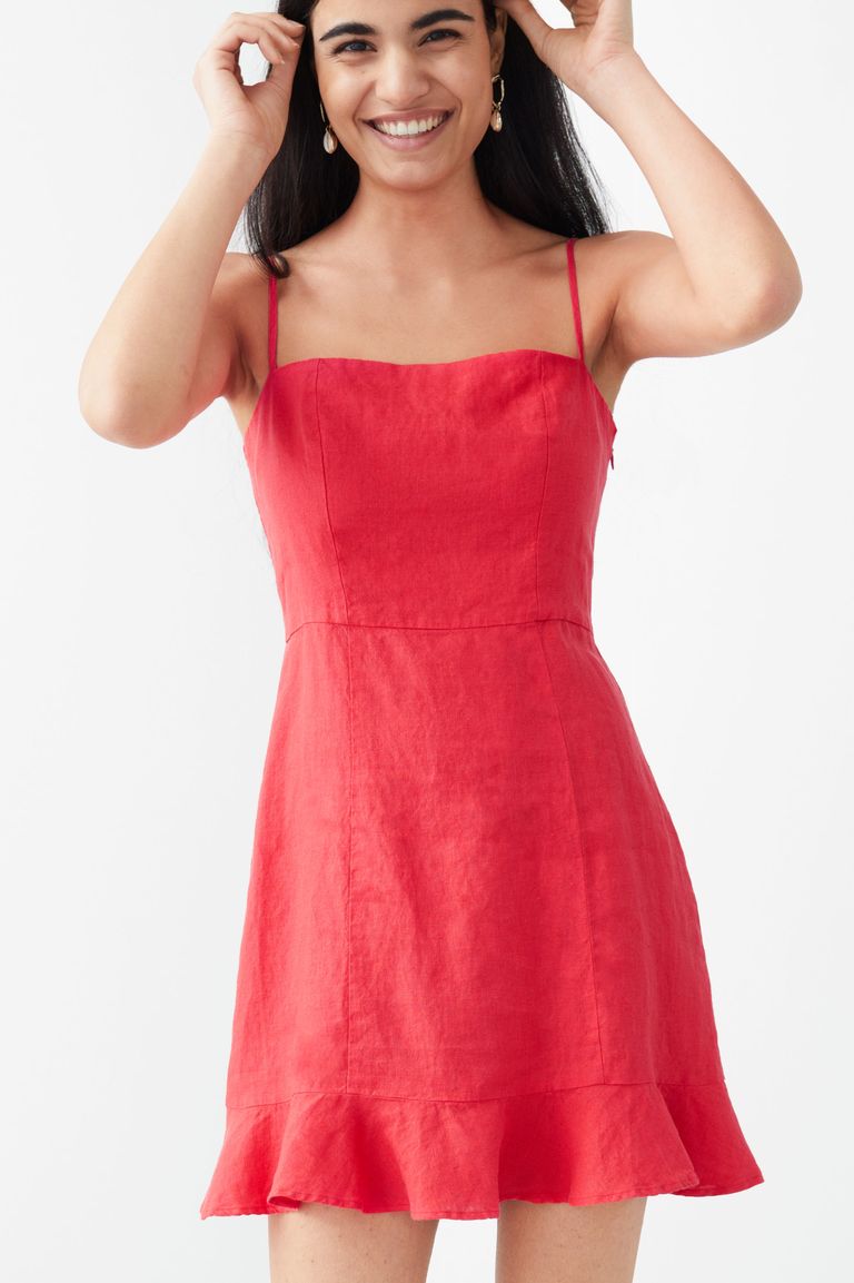 فستان كتان قصير باللون الأحمر سيكون مناسب لجميع أنواع الحفلات بالإضافة لإحساس الراحة والأناقة.